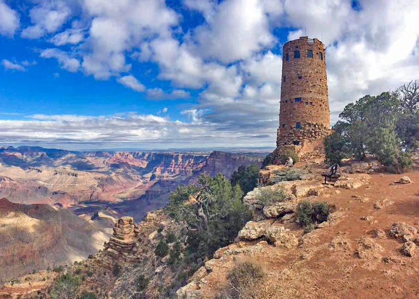 Desert View Watchtower - Ngọn tháp gác của sa mạc bất tận: tòa tháp đá cổ kính nằm sát mép vực, như người gác cổng trầm lặng nhìn về phía dòng Colorado uốn lượn. Từ ban công tầng cao nhất, tầm mắt mở ra vô tận các lớp đá xếp lên nhau như trang sách khổng lồ của lịch sử địa cầu.