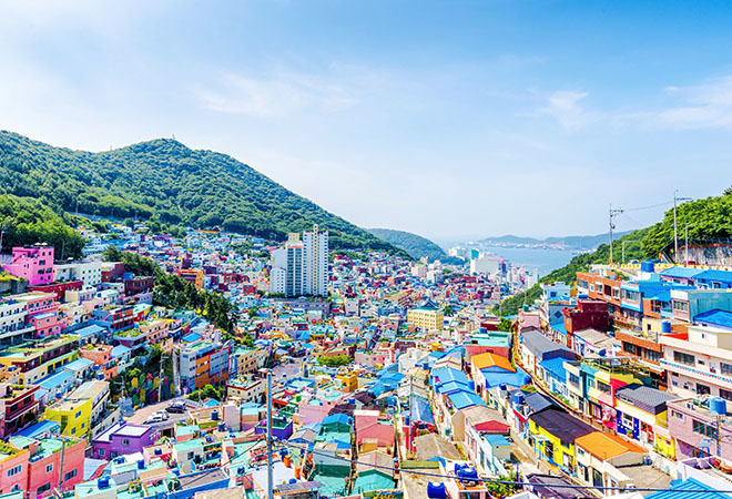 Làng bích hoạ Gamcheon - được những nghệ sĩ phục dựng bằng những sắc màu đầy tính nghệ thuật được mệnh danh là Santorini của xứ Kim Chi.