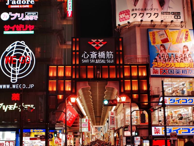 Shinsaibaishi khu mua sắm sầm uất nhất Osaka, Quý khách tự do mua sắm. Đặc biệt Quý khách có thể mua những món quà tặng cho người thân và bạn bè với giá rất rẻ tại cửa hàng đồng giá 100 yên Daiso.