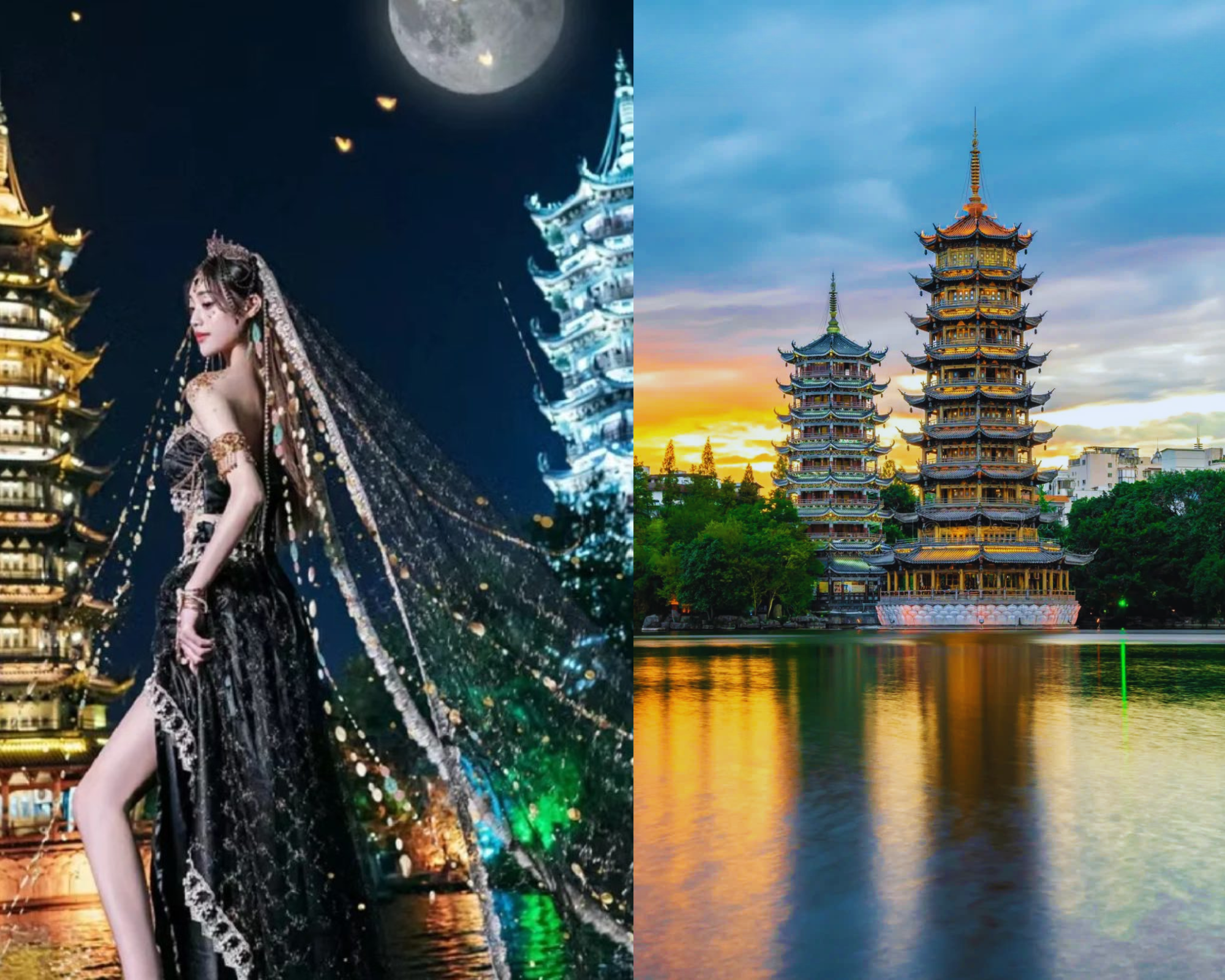 Tiếp tục ngắm Tháp Nhật - Nguyệt (Kim - Ngân Song Tháp) - biểu tượng mới của Quế Lâm, tọa lạc tại trung tâm thành phố: Tháp Nguyệt 9 tầng cao 47 m, đúc hoàn toàn bằng đồng, là tháp đồng trên nước cao nhất thế giới; Tháp Nhật 7 tầng cao 35 m, làm bằng lưu ly.